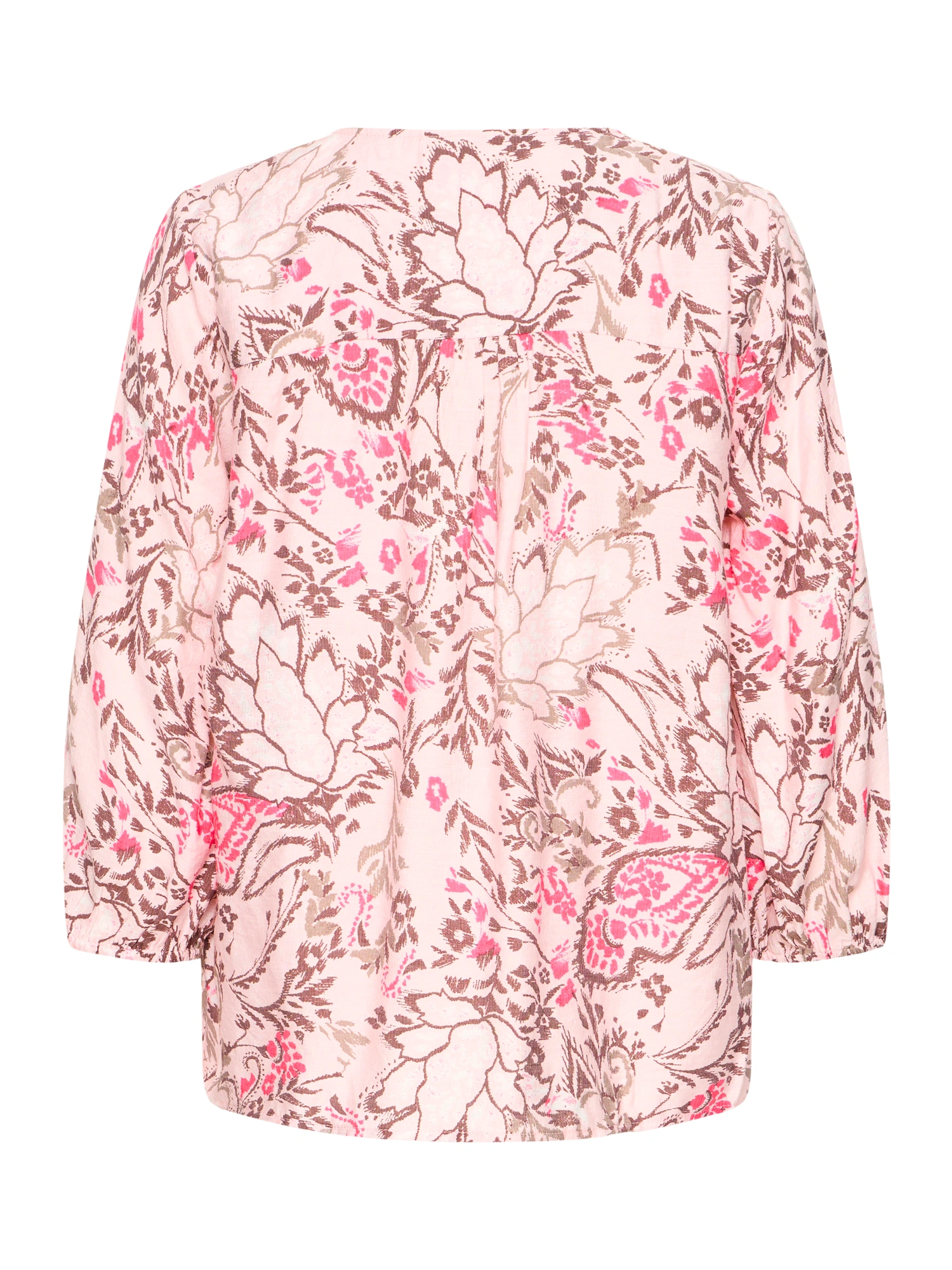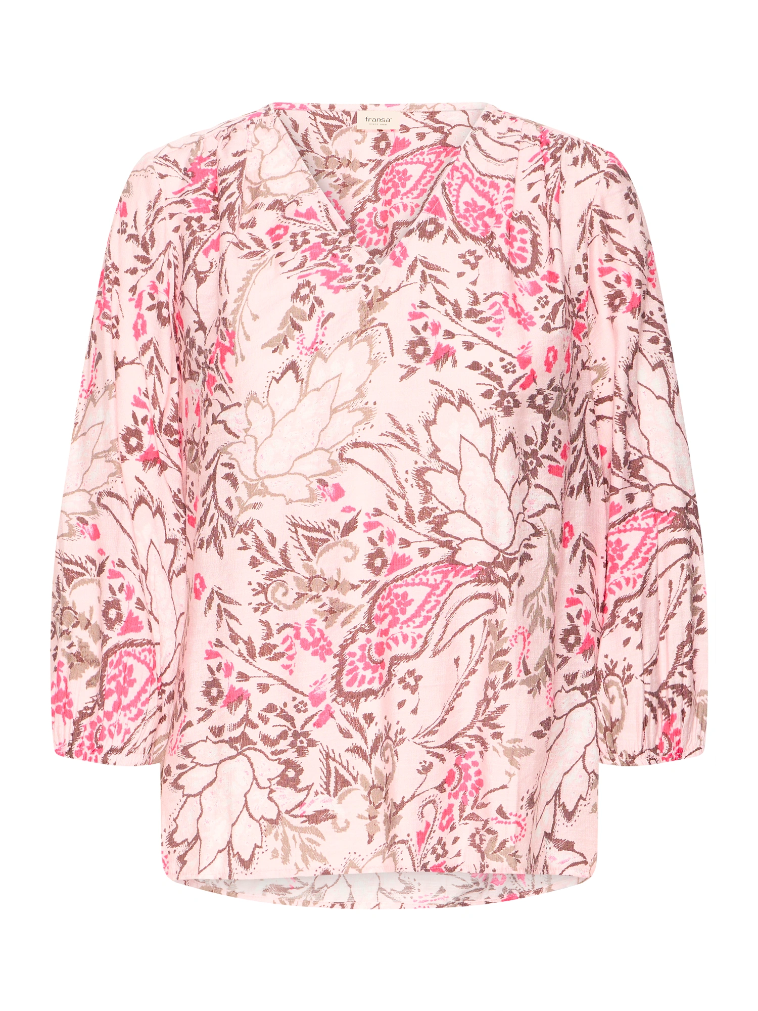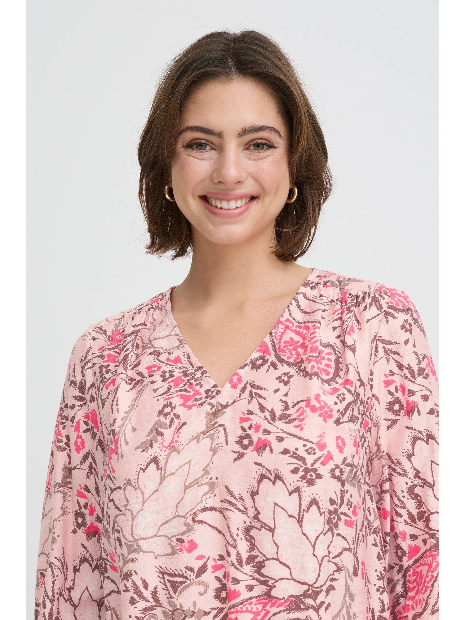 FRARIANA BL 6 Bluse FEMI BOUQUET LOTUS er en let bluse med et feminint blomsterprint i rosa nuancer. Modellen har et roligt og dekorativt udtryk, der gør den velegnet til både hverdag og pænere brug. Det fine mønster kombineret med den enkle silhuet giver et alsidigt design, som nemt kan styles med både jeans og klassiske bukser.