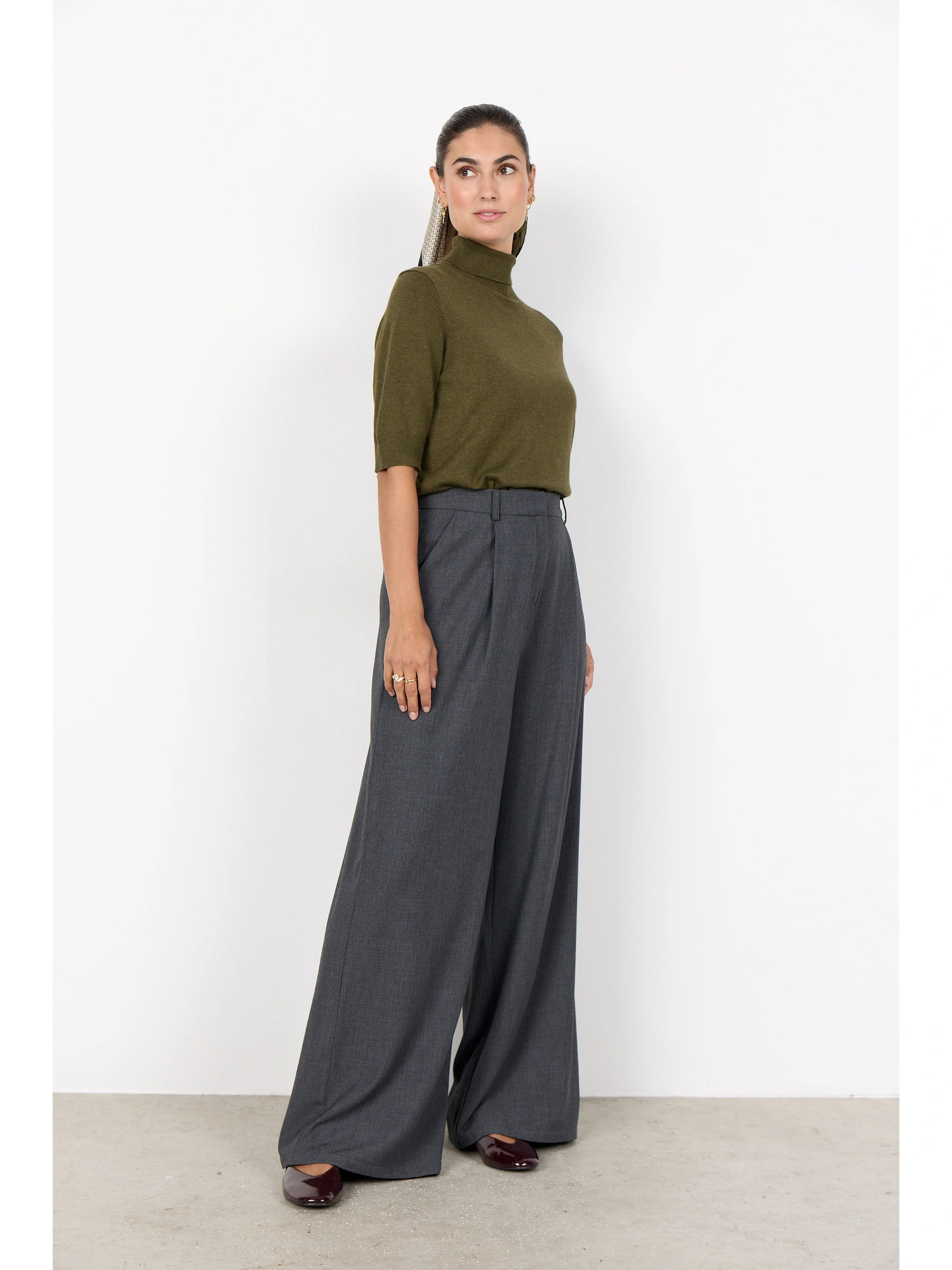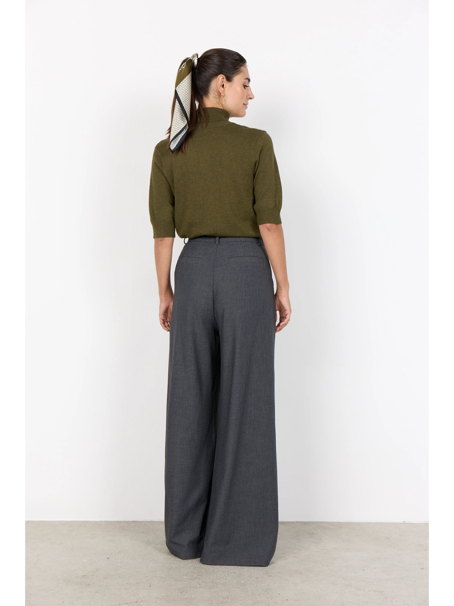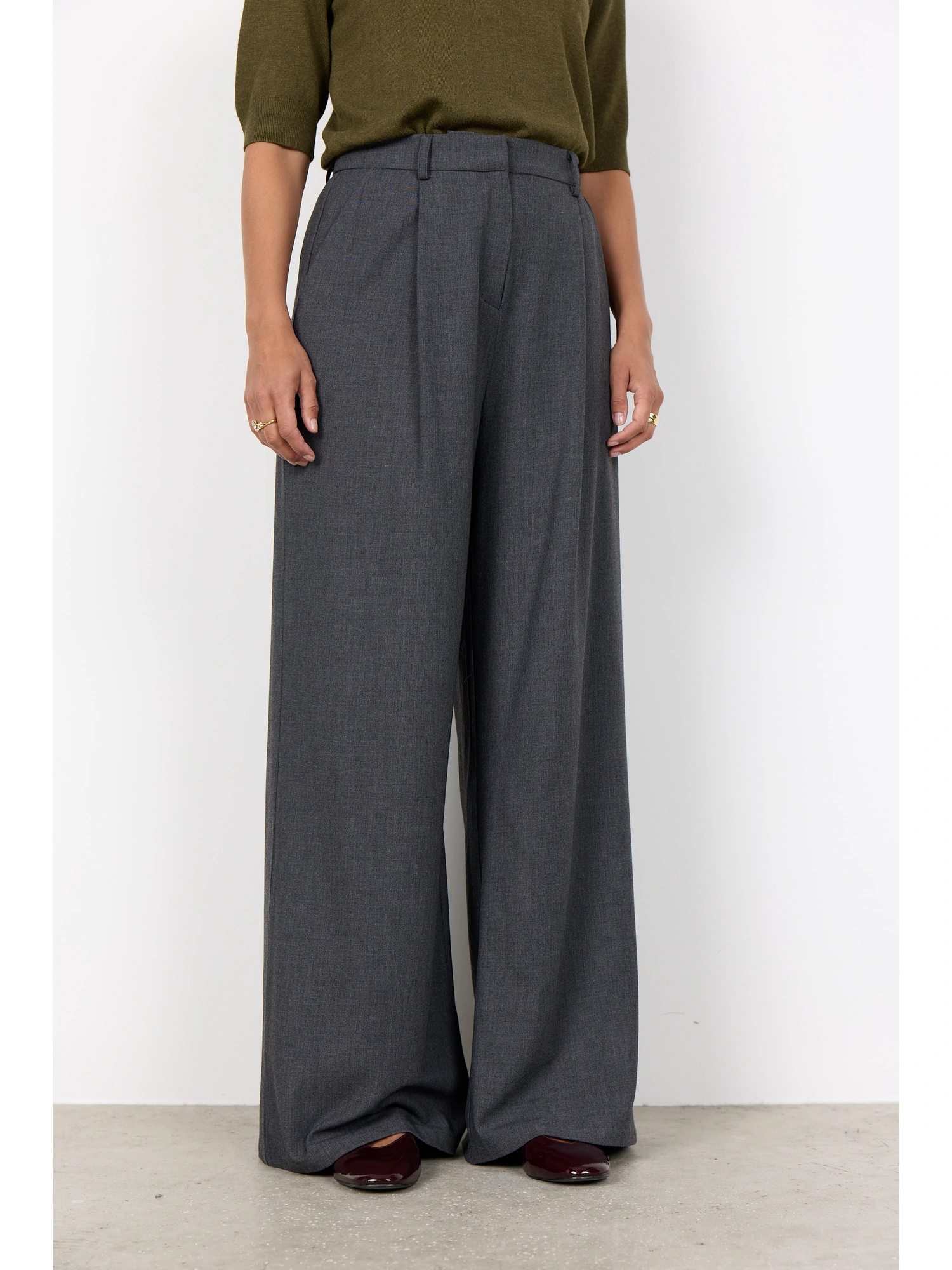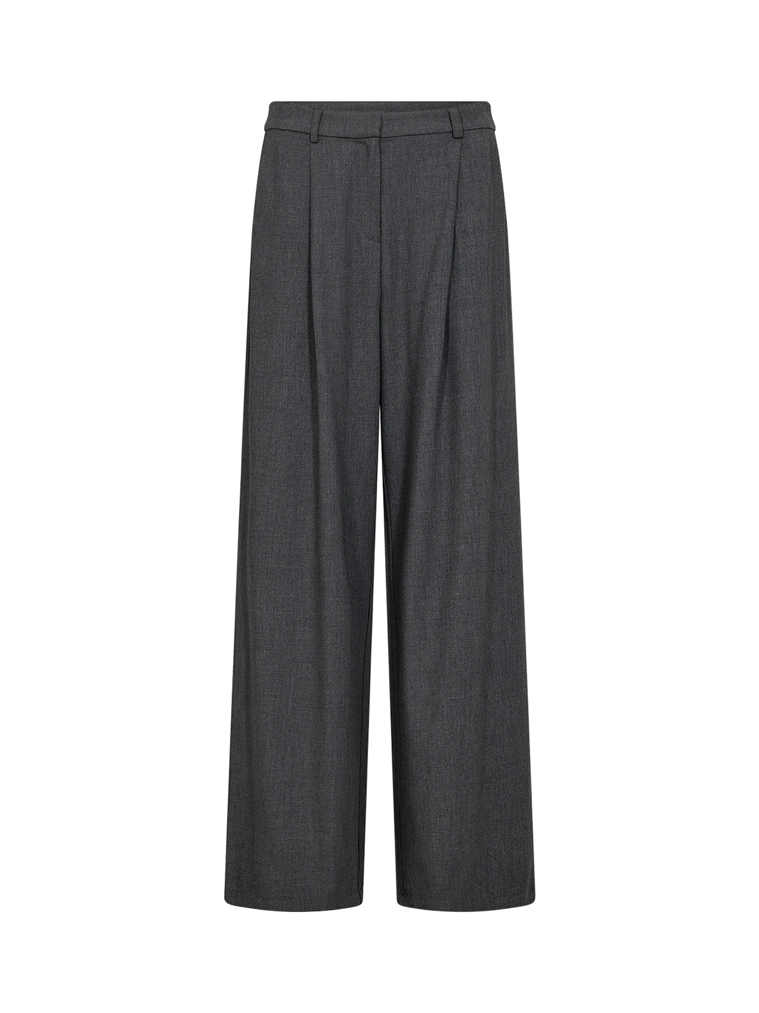SC-VENUS 3-C Pants er fremstillet af 65 % genbrugspolyester, 32 % viskose og 3 % elastan. De har høj talje, brede ben og diskrete læg for ekstra tekstur. Sæt dem sammen med en nedringet bluse og loafers for et raffineret look.