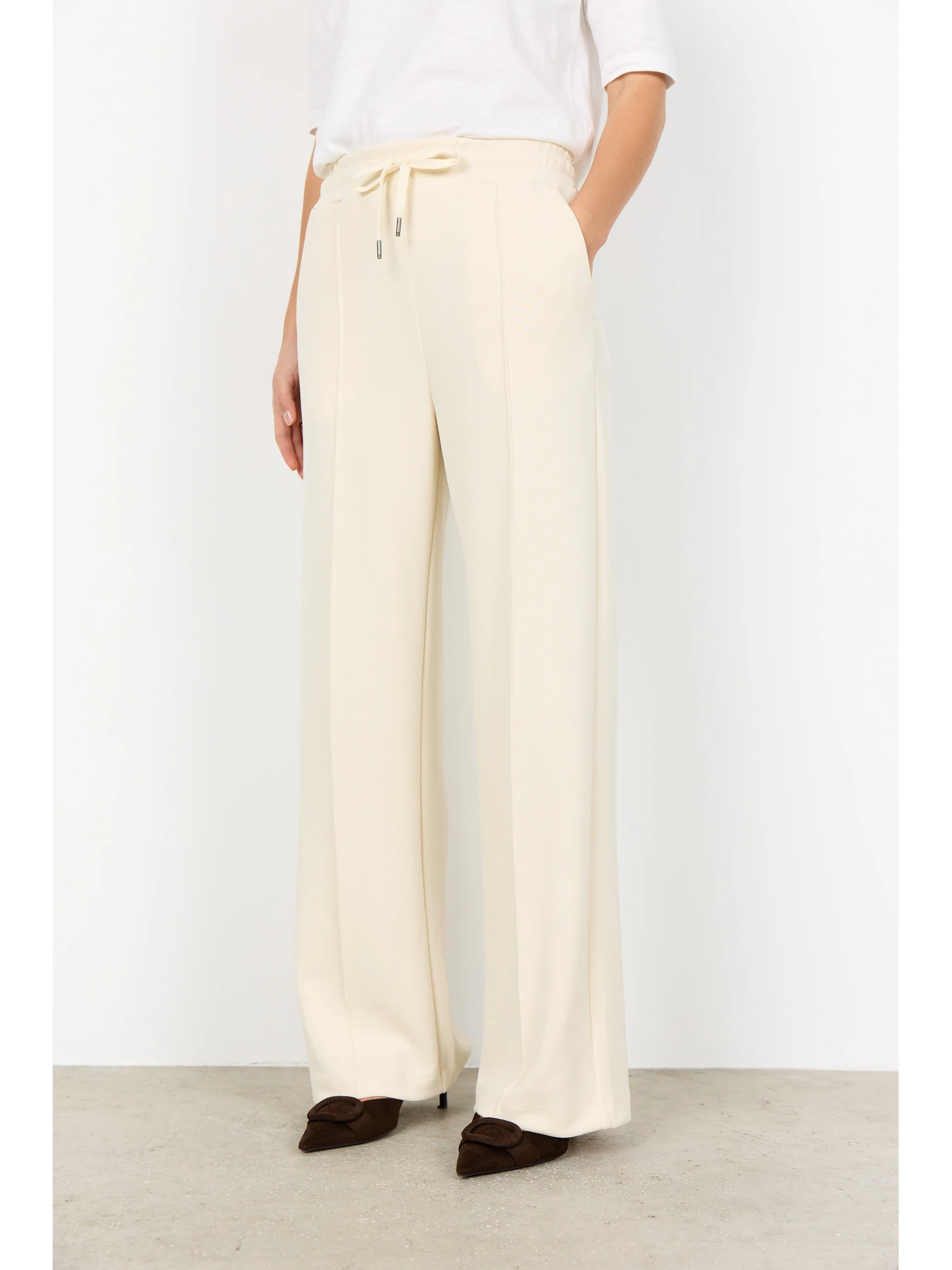 Designet er holdt enkelt og funktionelt. De diskrete sidelommer tilfører både praktisk anvendelighed og et mere gennemført udtryk. Kombinationen af rene linjer, blødt materiale og justerbar talje gør bukserne alsidige i brug.