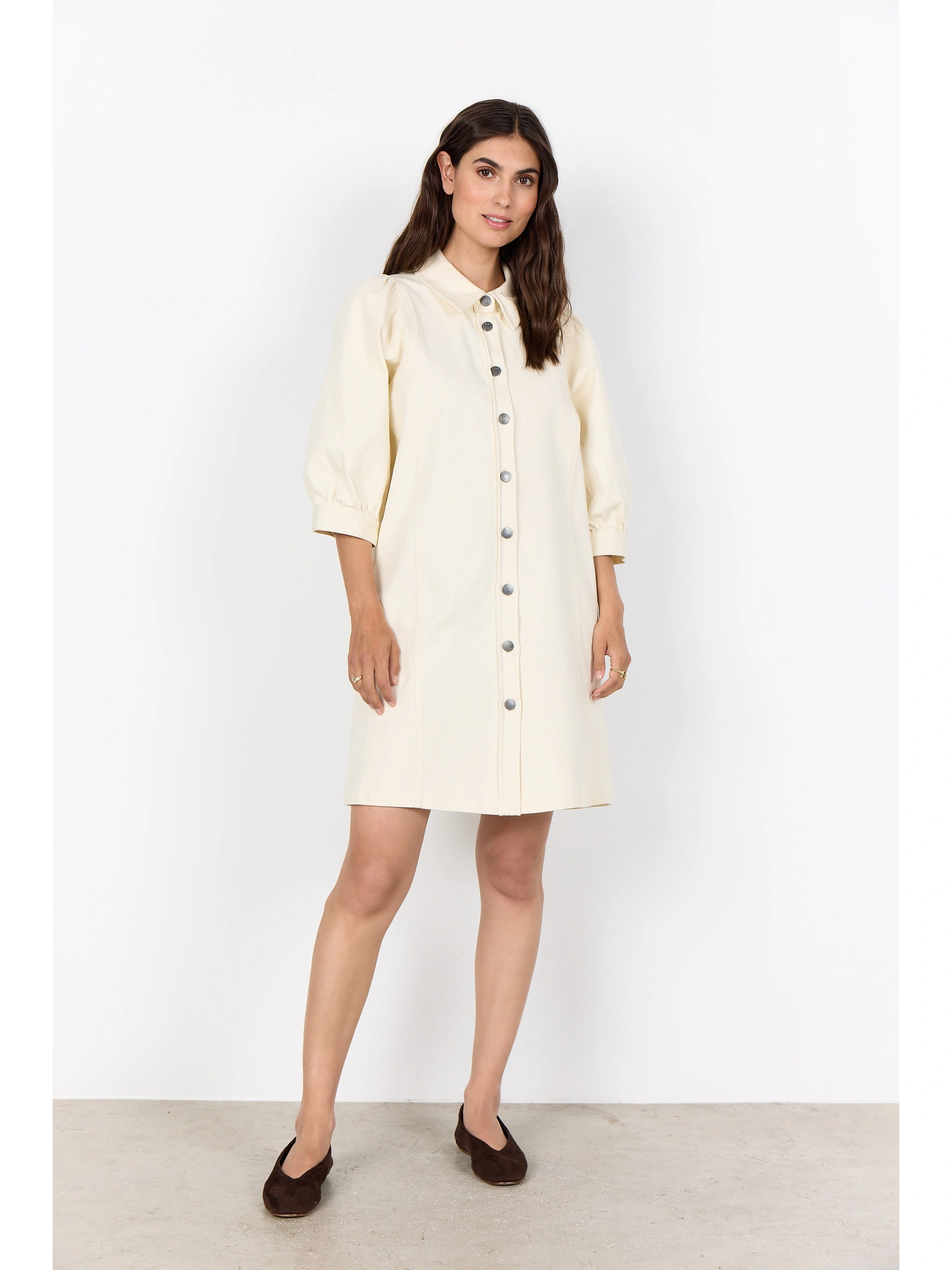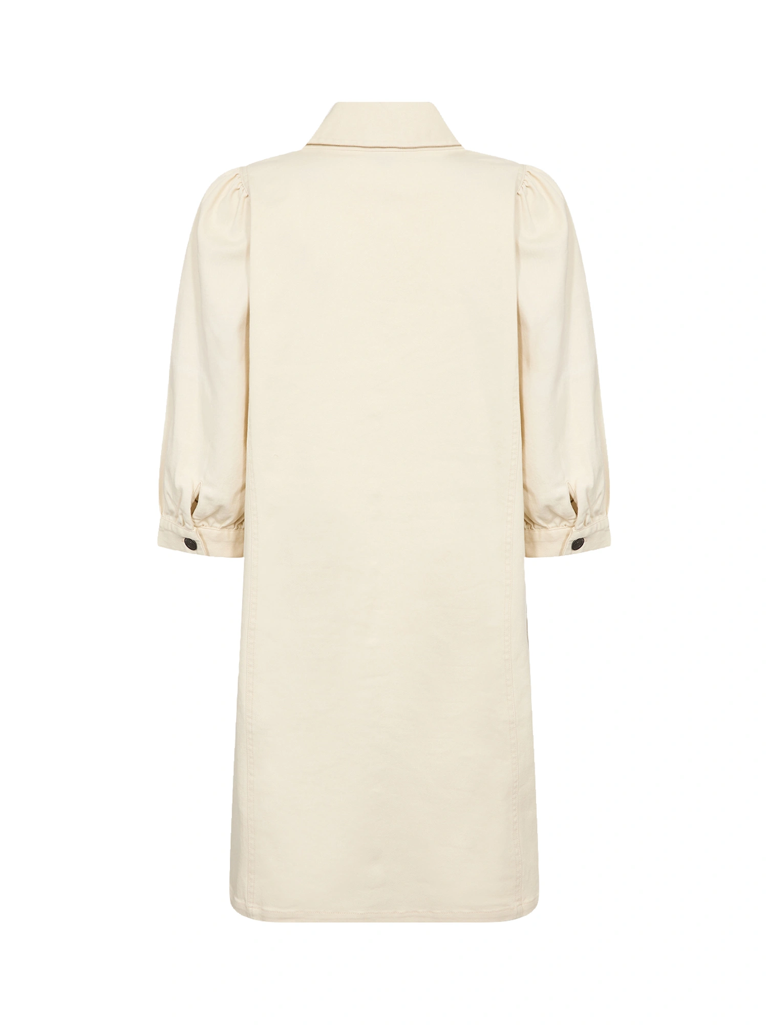 Designet er kendetegnet ved en klassisk krave og fuld knaplukning foran, hvilket giver et rent og struktureret udtryk. Det knælange snit gør kjolen velegnet til både hverdag og pænere anledninger, mens de diskrete pufærmer tilfører et feminint og velafbalanceret detalje niveau.