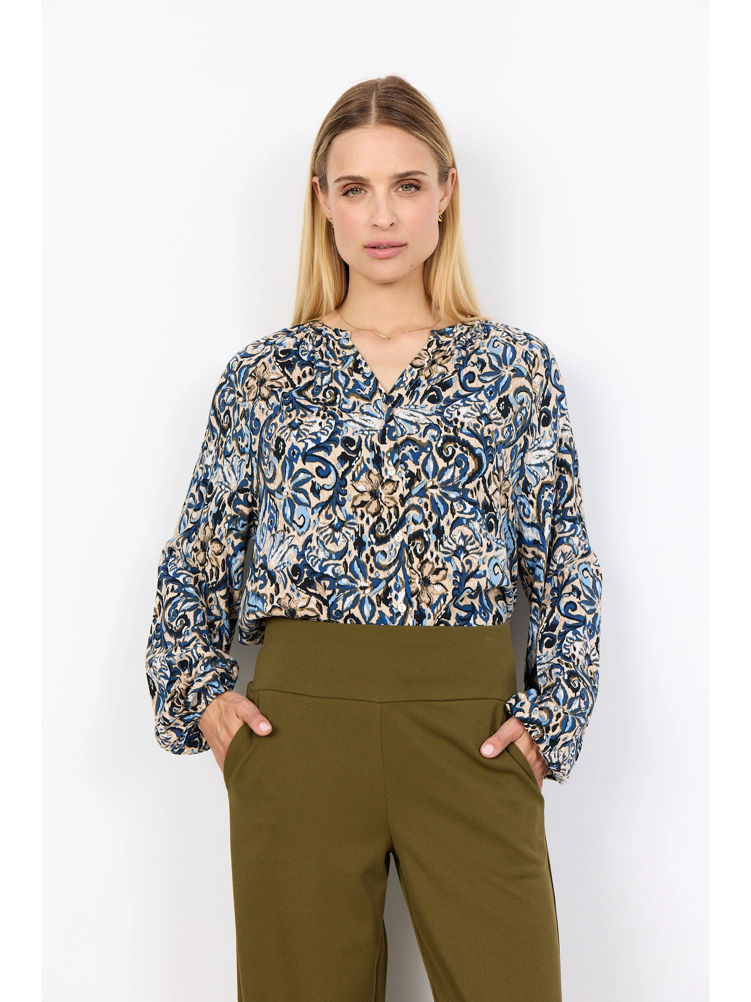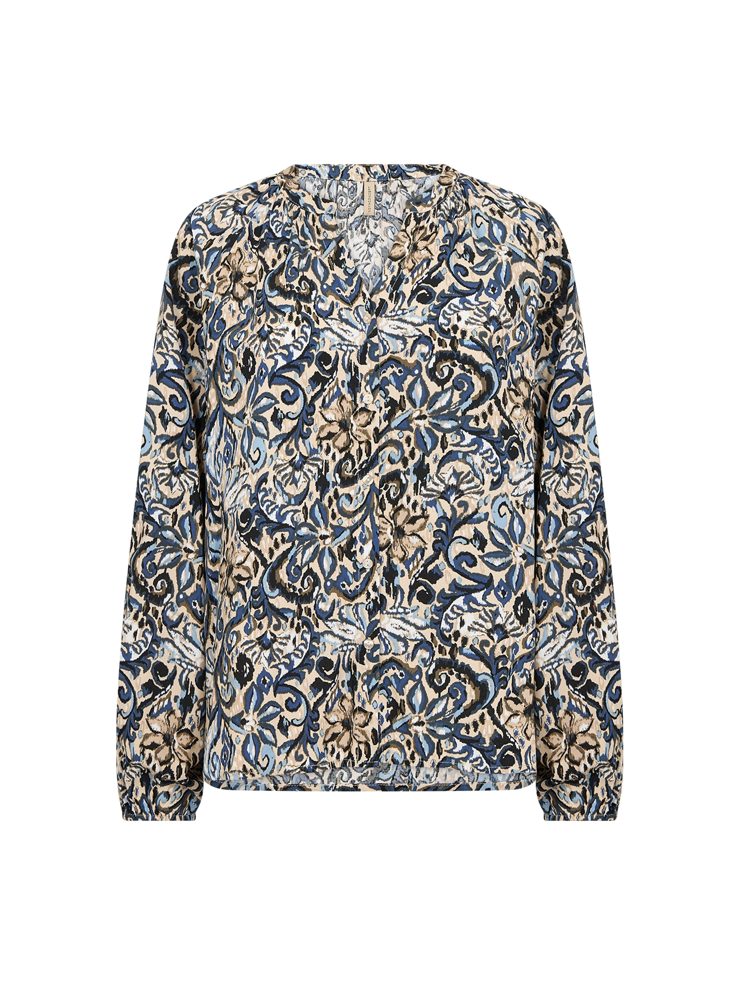 SC-VAVA 1 Shirt er fremstillet af 100 % LENZING™ ECOVERO™-viskose. Den har V-udskæring, lange ærmer og et dristigt, indviklet print. Sæt den sammen med skræddersyede bukser eller denim for et stilfuldt look.