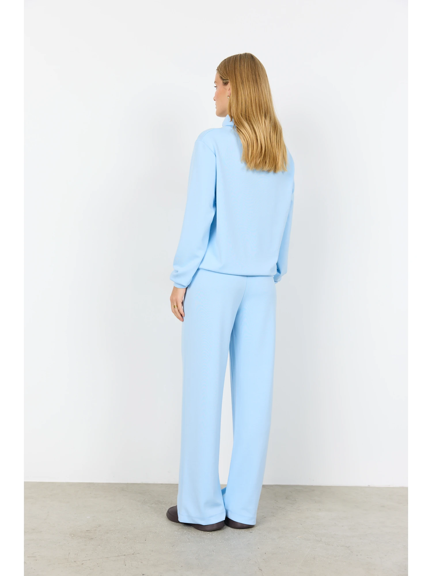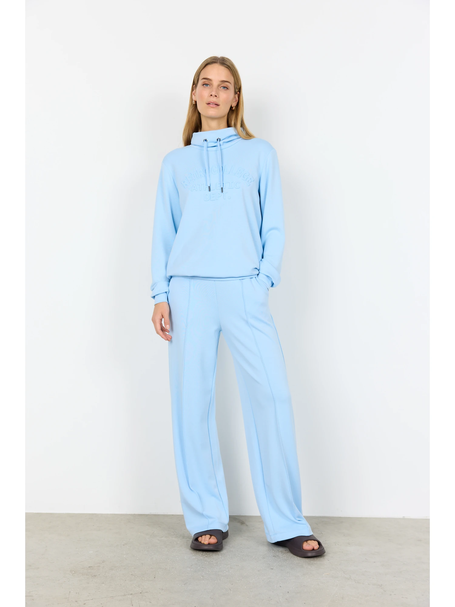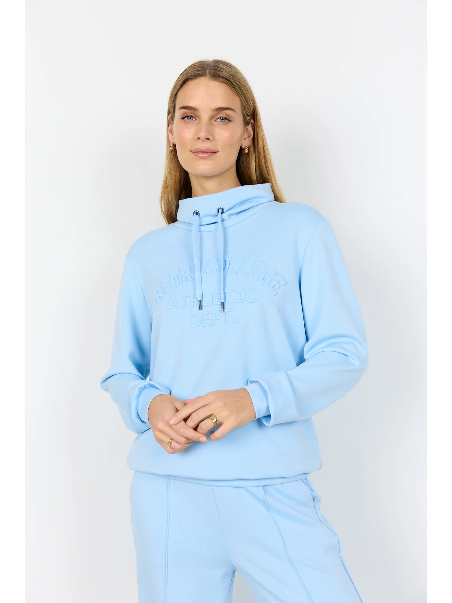 Sweatshirten er designet med fokus på funktionelle detaljer. Den høje krave skaber struktur, mens printet på fronten giver et diskret visuelt fokus. Helheden er enkel og let at kombinere med andre styles i garderoben.