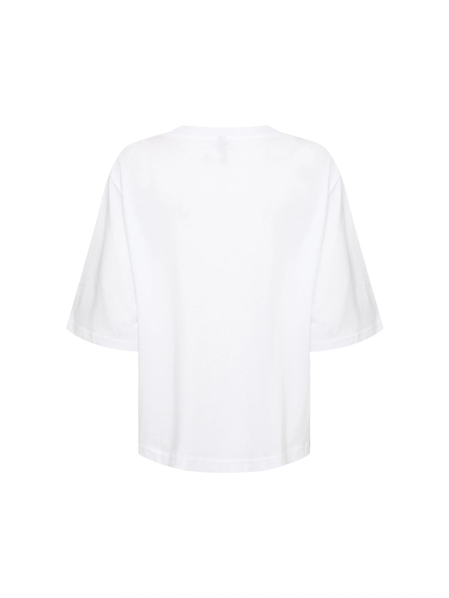 Modellen har en klassisk rund halsudskæring og mellemlange ærmer, der understøtter det afslappede udtryk. Den lige kant forneden og det rummelige snit giver T-shirten en oversize pasform, som falder naturligt og komfortabelt.