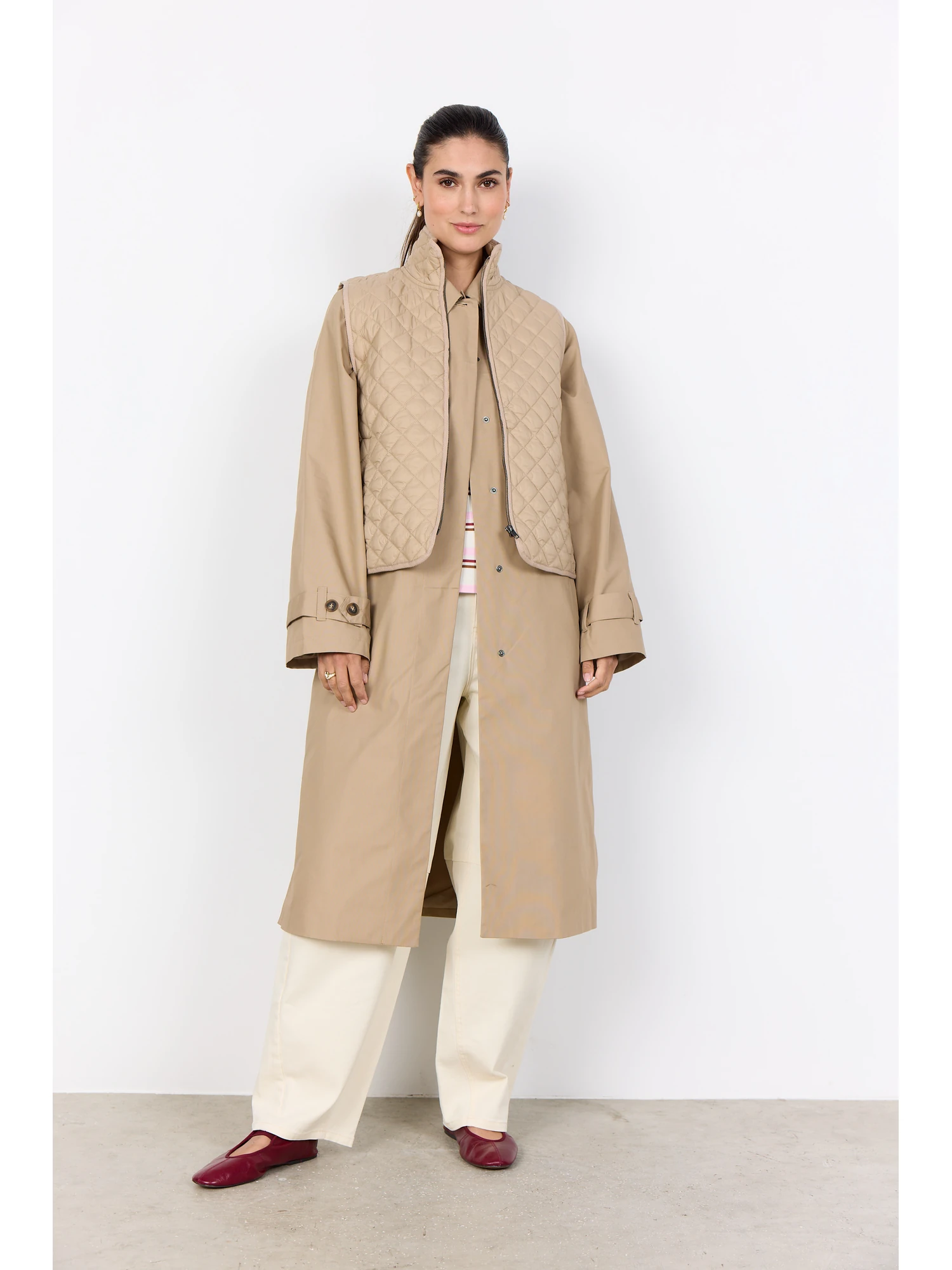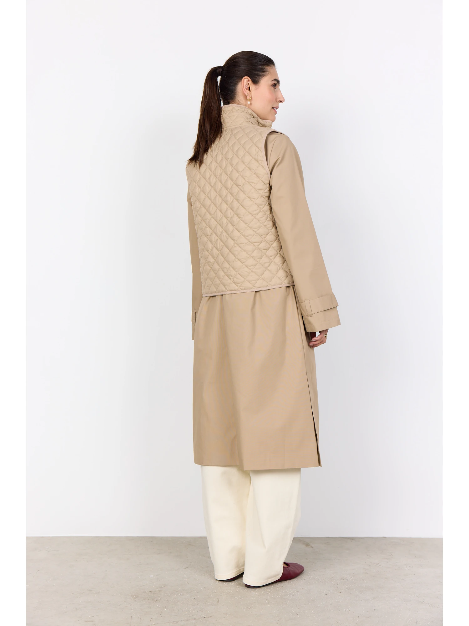 SC-BENETE 1 er en let og funktionel vest med et rent, moderne udtryk. Den quiltede overflade giver struktur og dybde, mens den høje krave og den gennemgående lynlåslukning tilfører både funktion og et skarpt snit. Vesten er velegnet som et fleksibelt lag, der nemt kan styles over en rullekrave eller let strik.