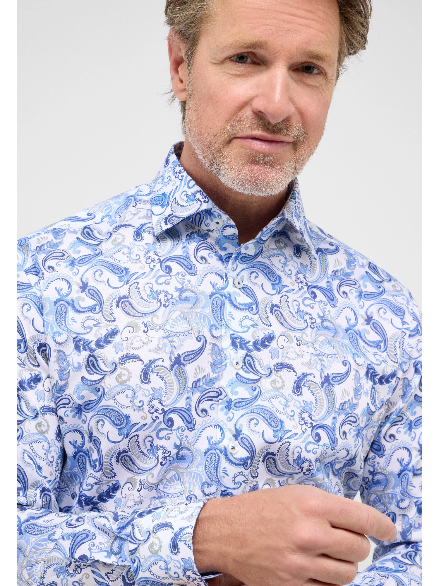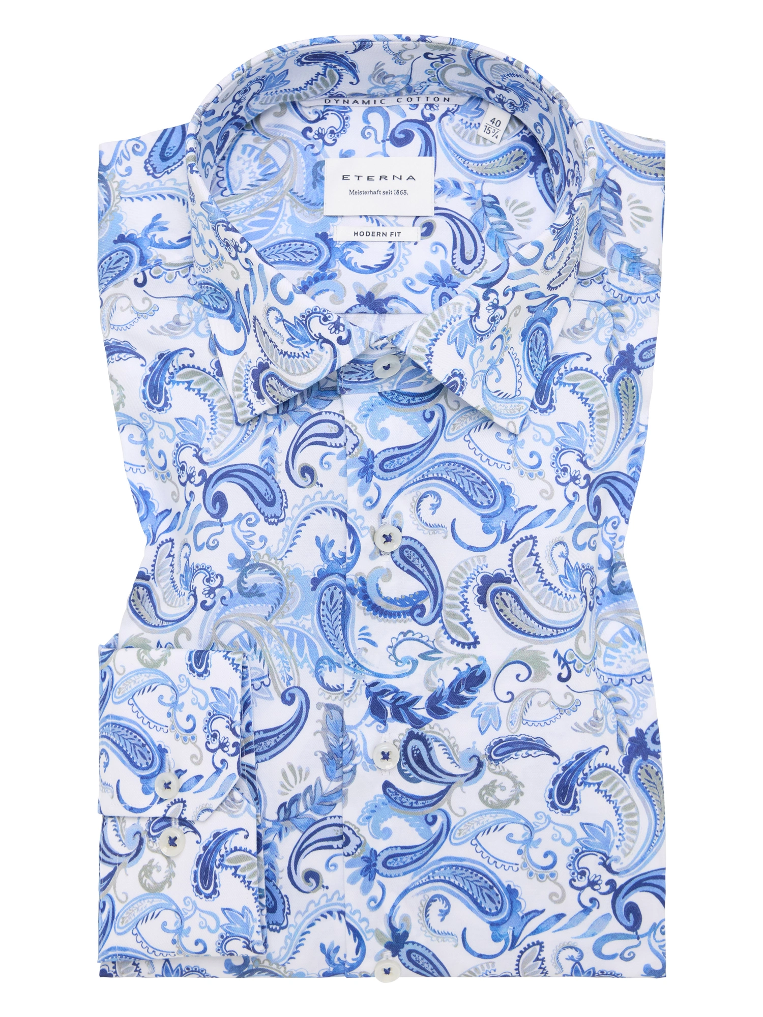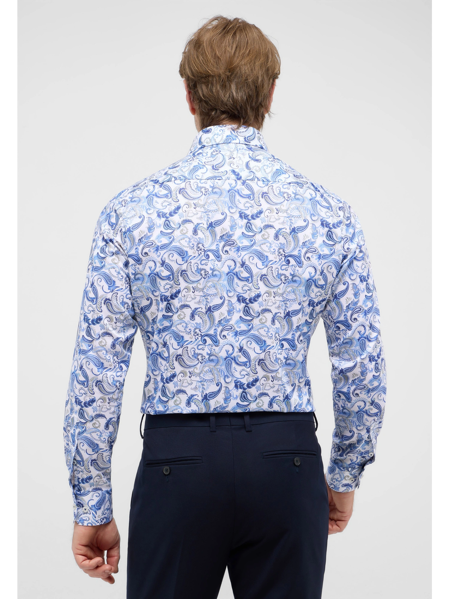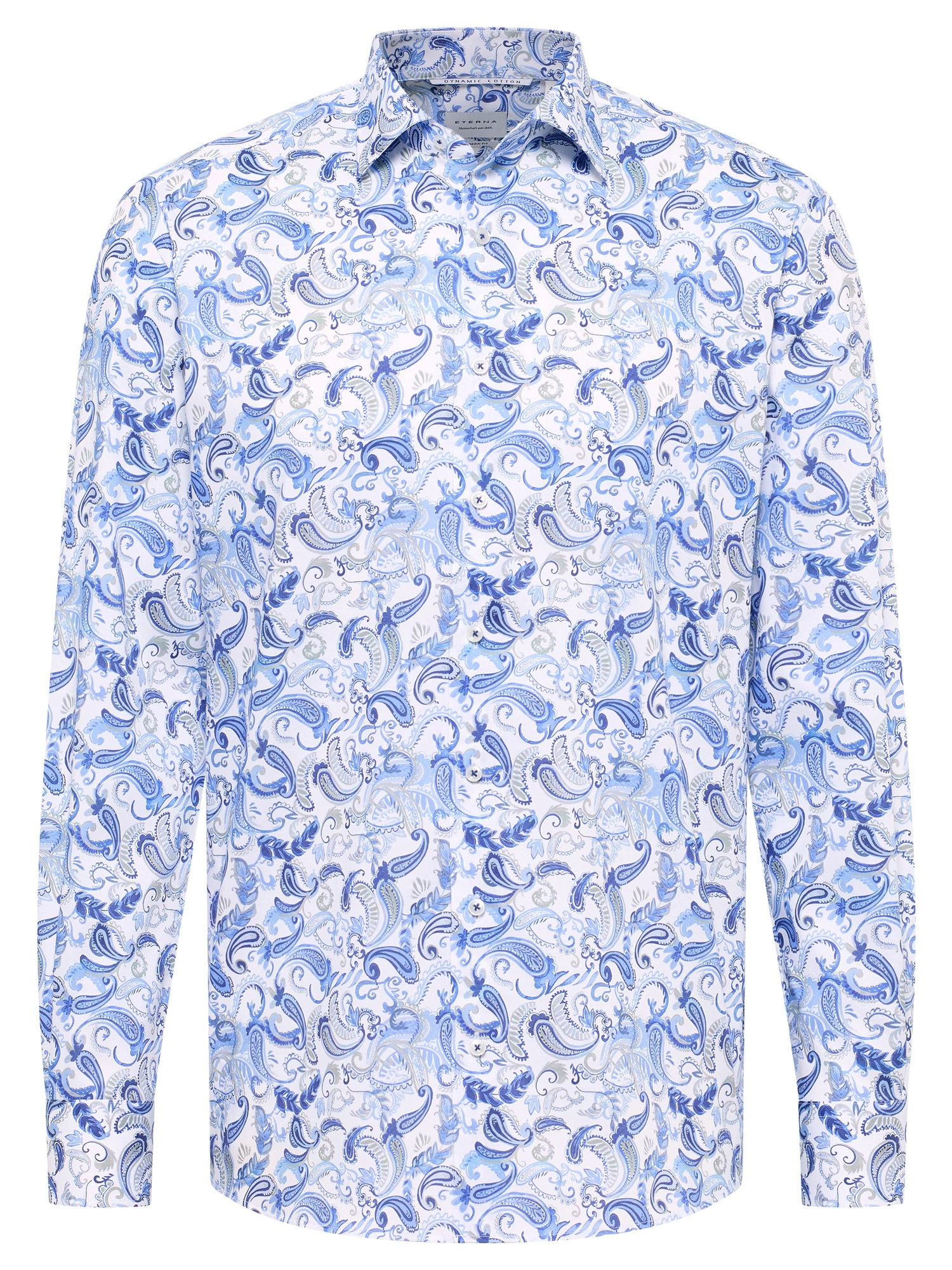 Eterna Modern fit Skjorte 4503/X18K Blue er en langærmet skjorte med et markant paisley print og et moderne udtryk. Modellen er fremstillet i Dynamic Cotton™, hvor komfort og et skarpt udseende kombineres i én kvalitet. Skjorten er velegnet til både kontorbrug og fritid, afhængigt af hvordan den styles.