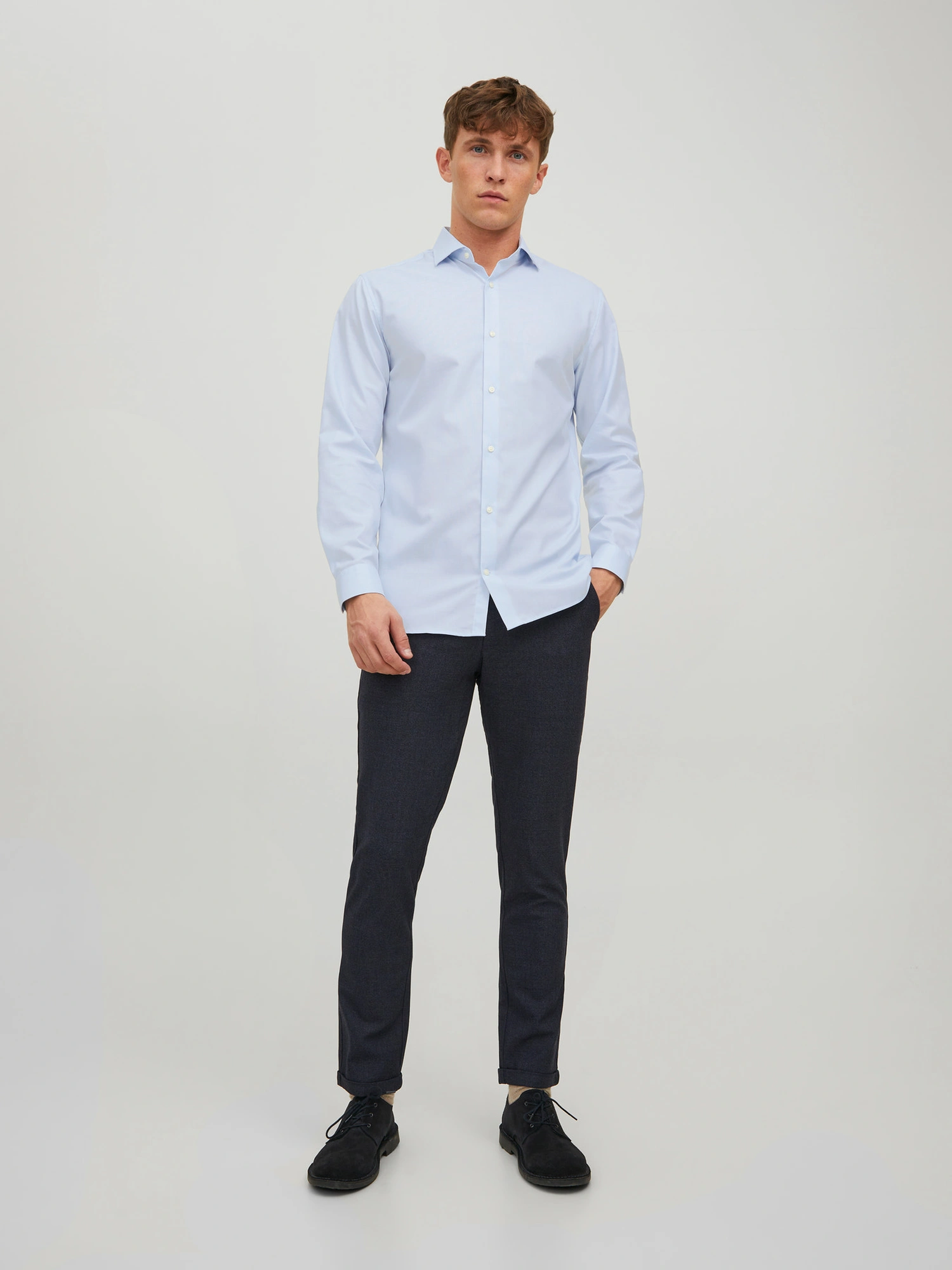 Velegnet til habit eller blazer i professionelle sammenhænge. Den lyseblå nuance fungerer også godt til mørke chinos eller jeans for et mere afslappet, men stadig velklædt look.