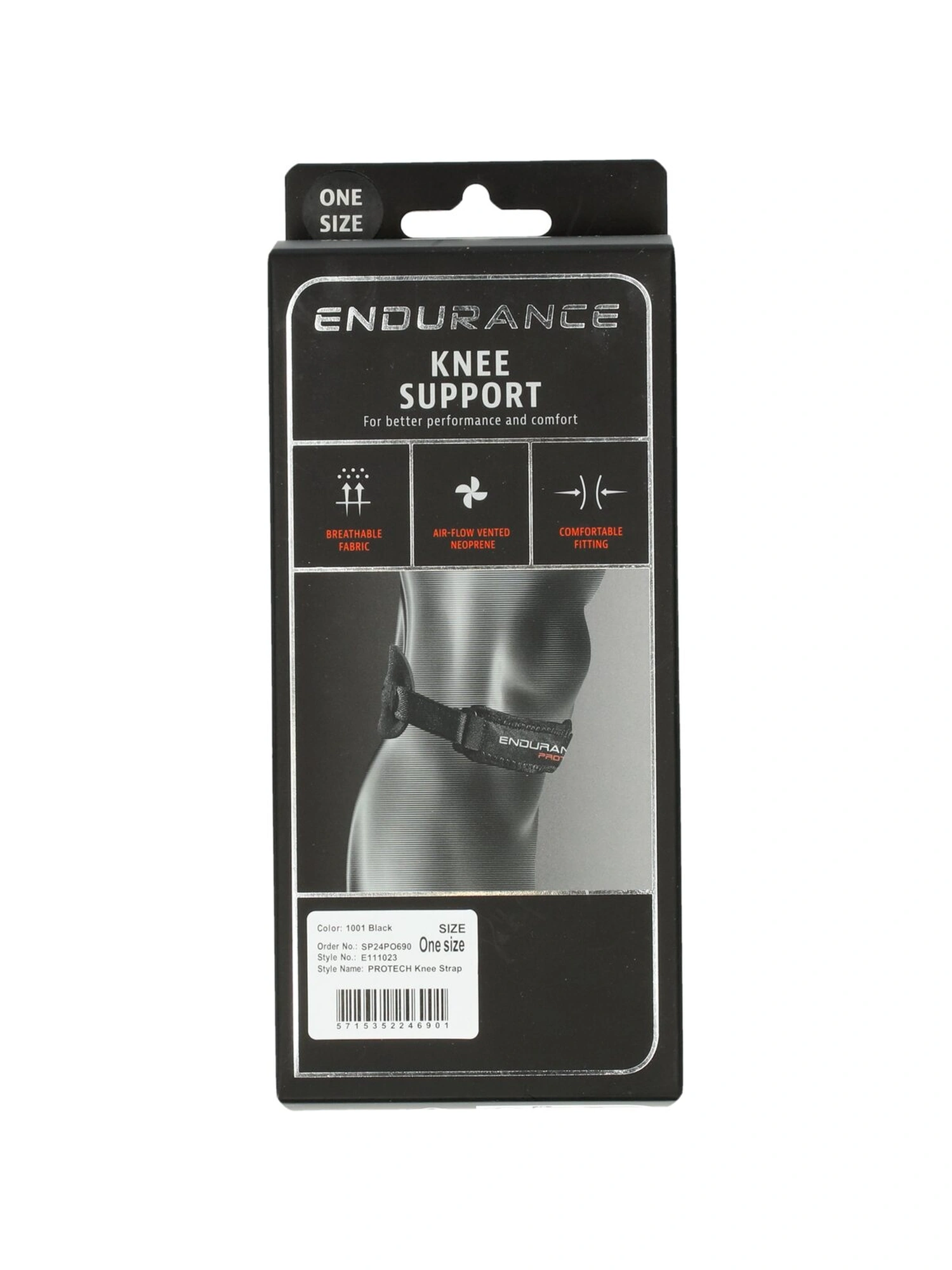 ENDURANCE PROTECH Knee Strap er en justerbar knæstrop, udviklet til at give målrettet støtte omkring knæets forside og senen under belastning. Modellen er designet til at aflaste området omkring knæskallen og give en mere kontrolleret bevægelse under fysisk aktivitet, uden at begrænse bevægeligheden i selve knæleddet.