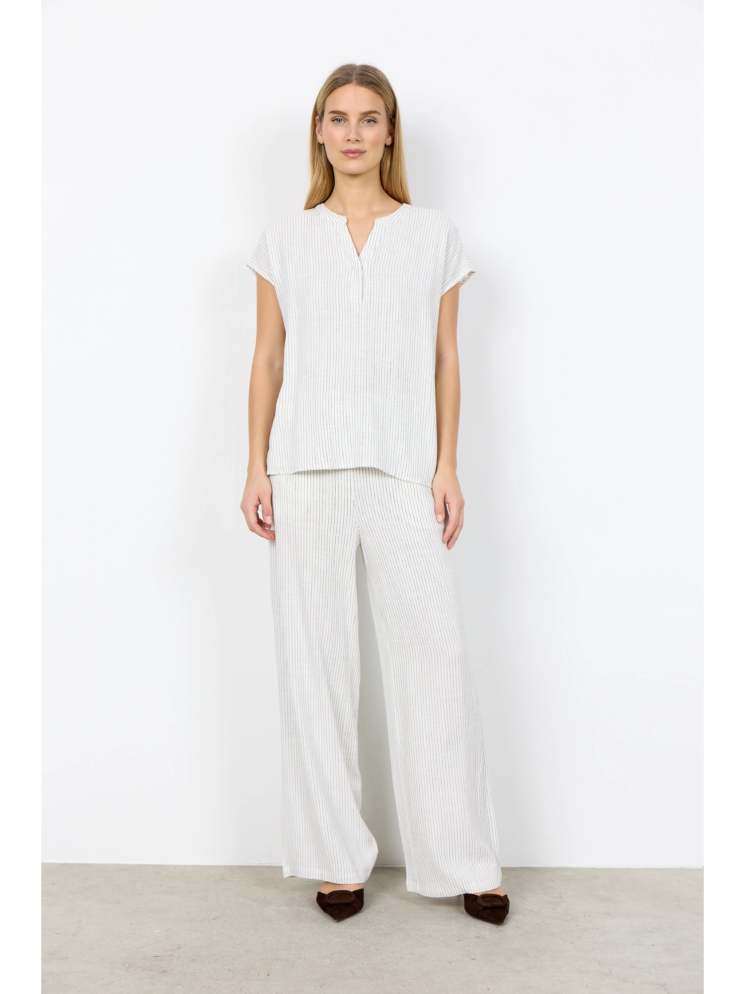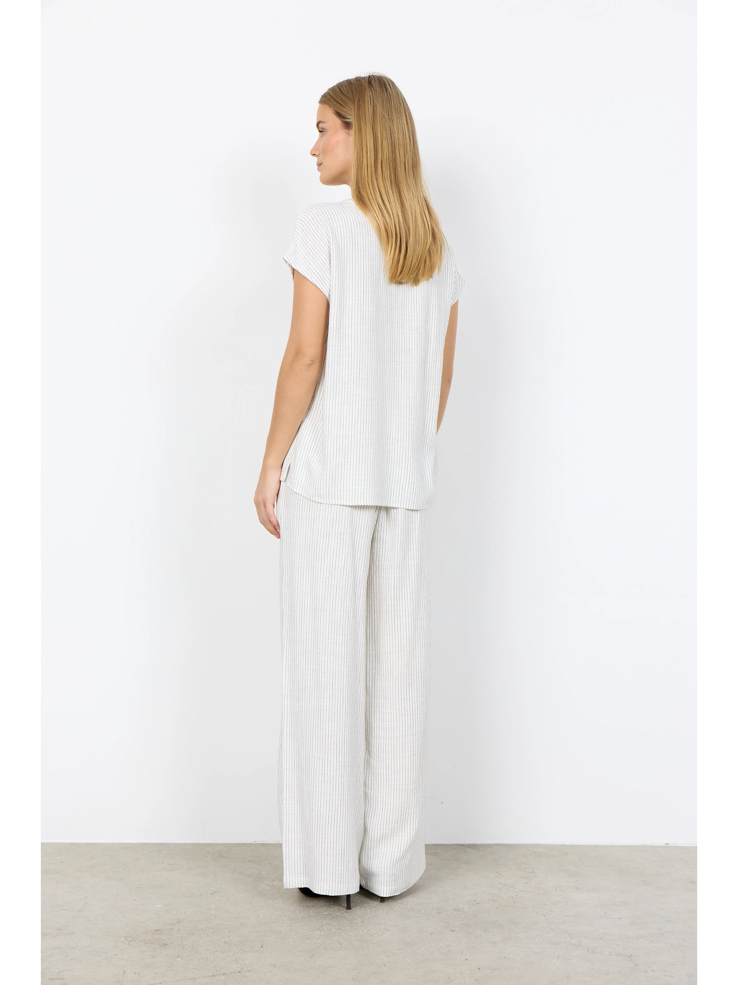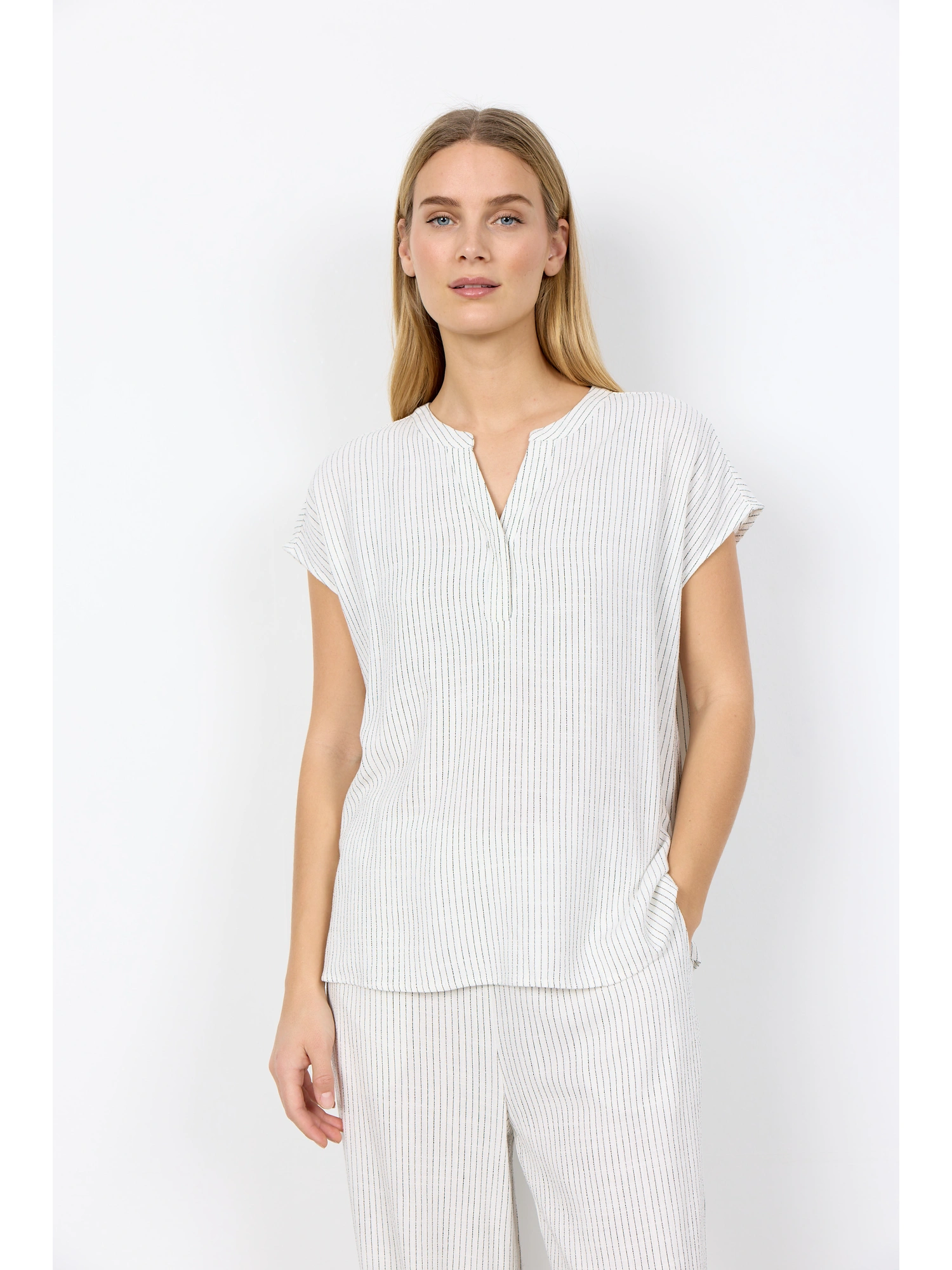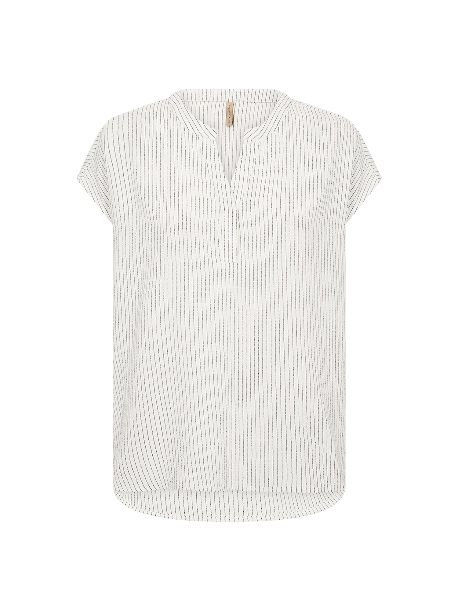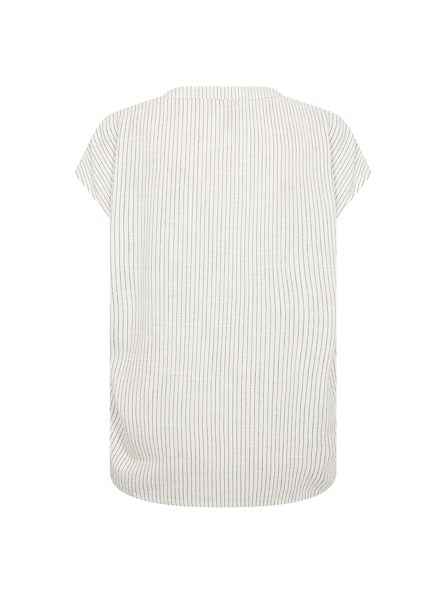 Blusen har et fint stribemønster, der tilfører et diskret visuelt udtryk uden at virke markant. De korte ærmer understøtter det afslappede snit og gør modellen velegnet til både hverdag og mere pæne anledninger.