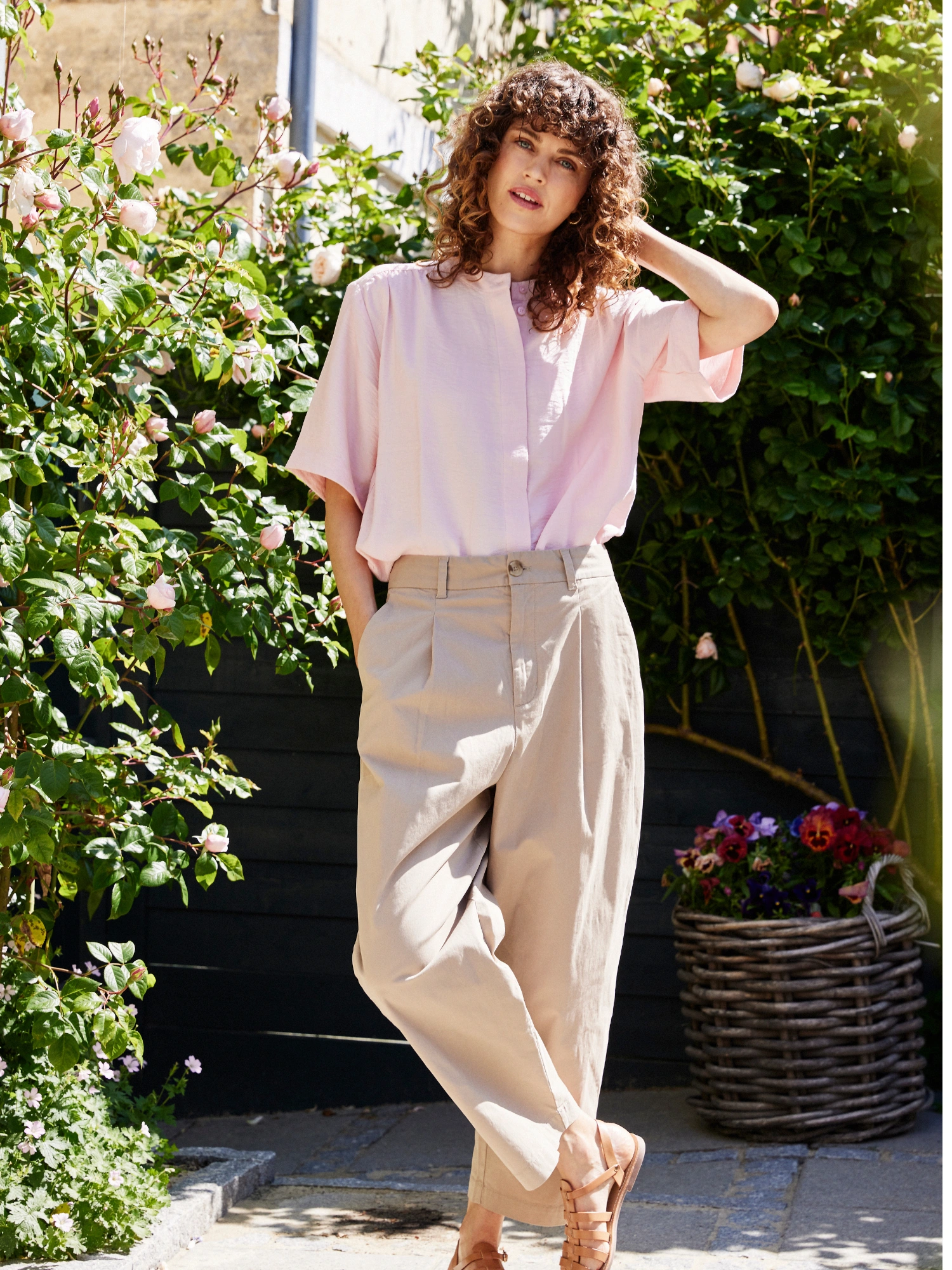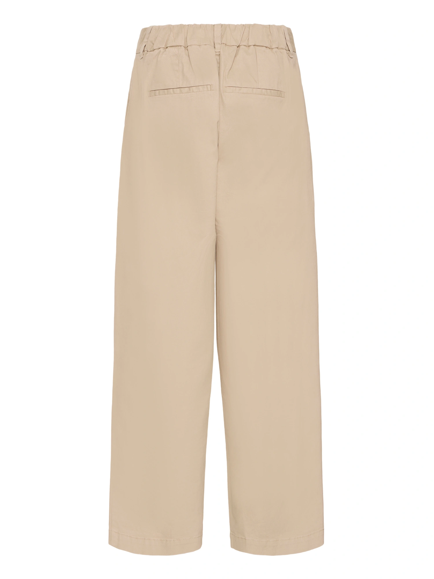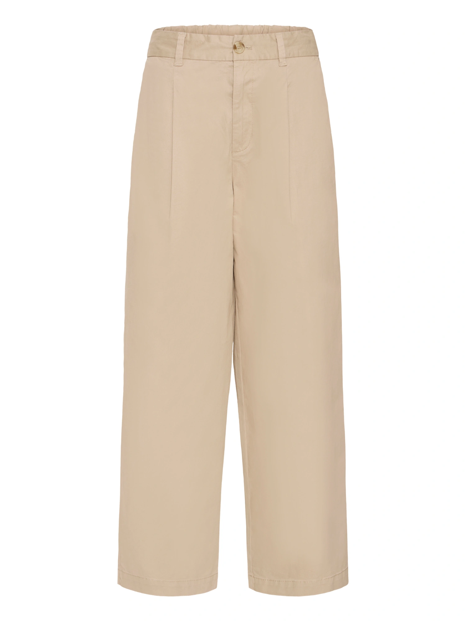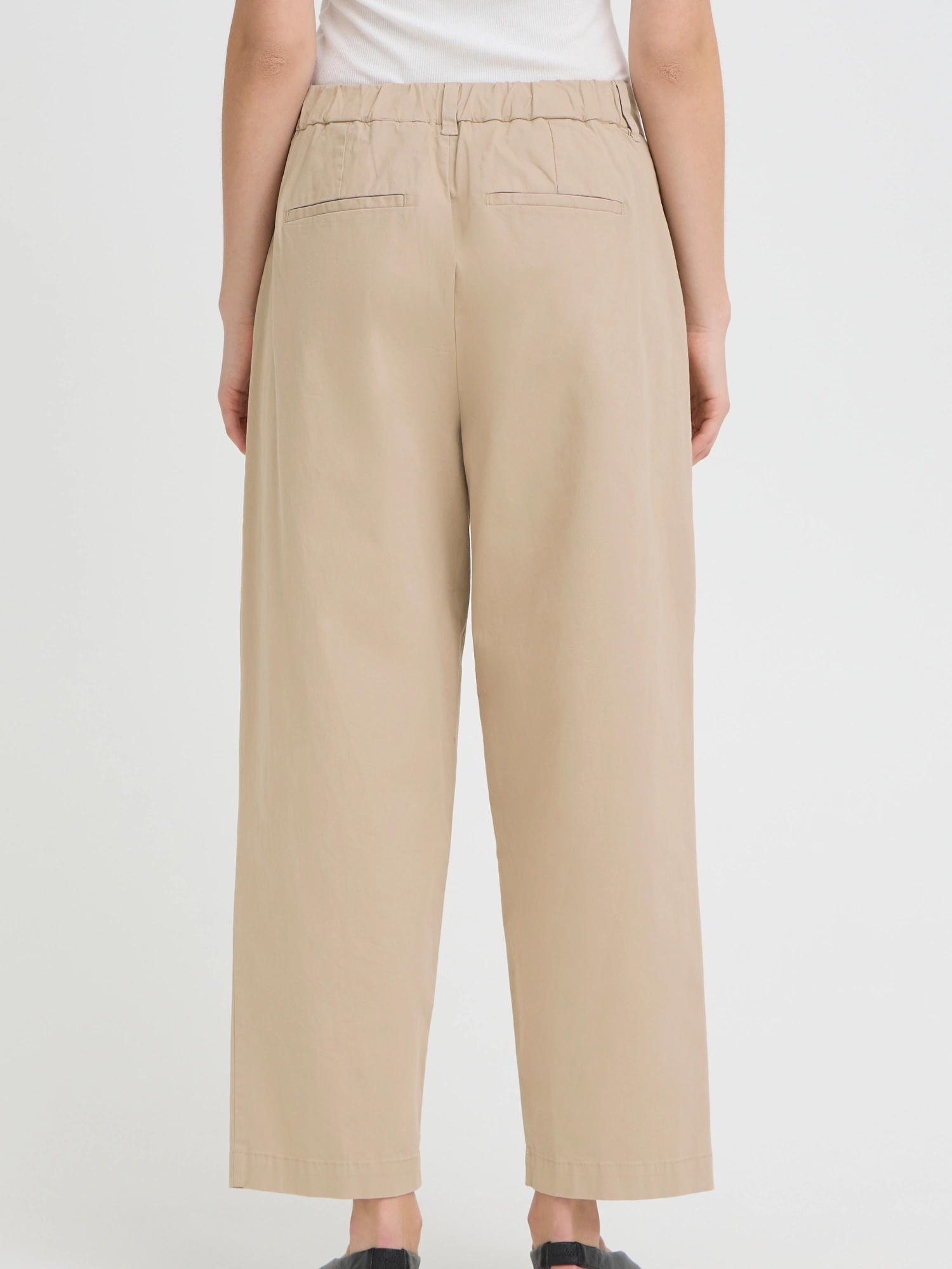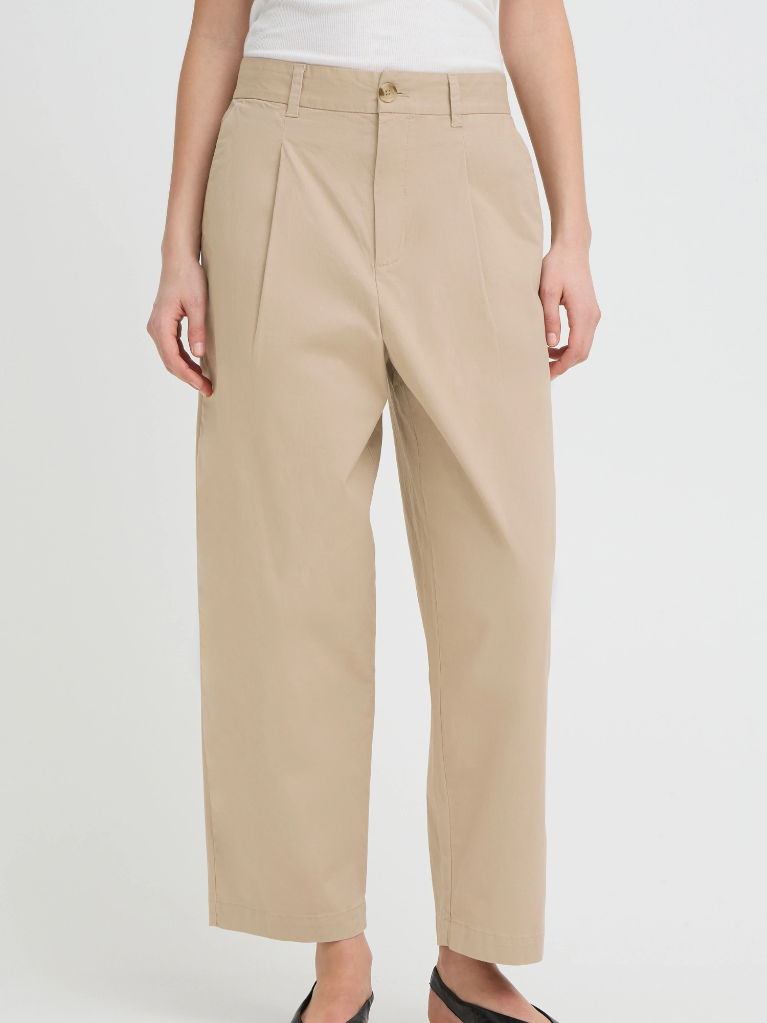 Bukserne er skåret med en bred lige benlinje fra hofte til ankel uden indsnævring. Der er plads omkring hofter og lår, og taljen er konstrueret med frontlæg uden stram pasform, hvilket giver en mere rummelig form end slim fit.