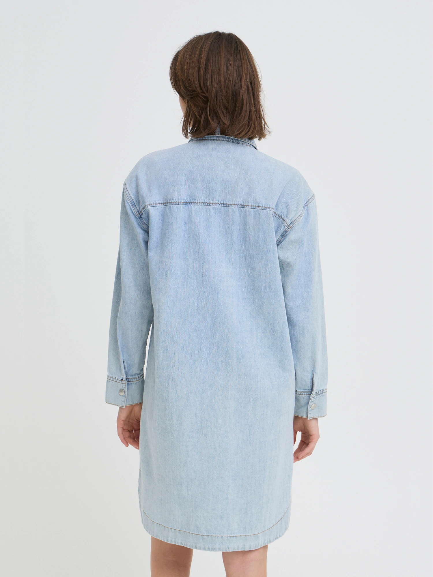 Kjolen er skåret i en lige silhuet uden indsnit, hvilket giver en afslappet form. Der er god plads ved bryst og hofter, og ærmerne er udformet med bredde, så den ikke sidder tæt som en slim fit.
